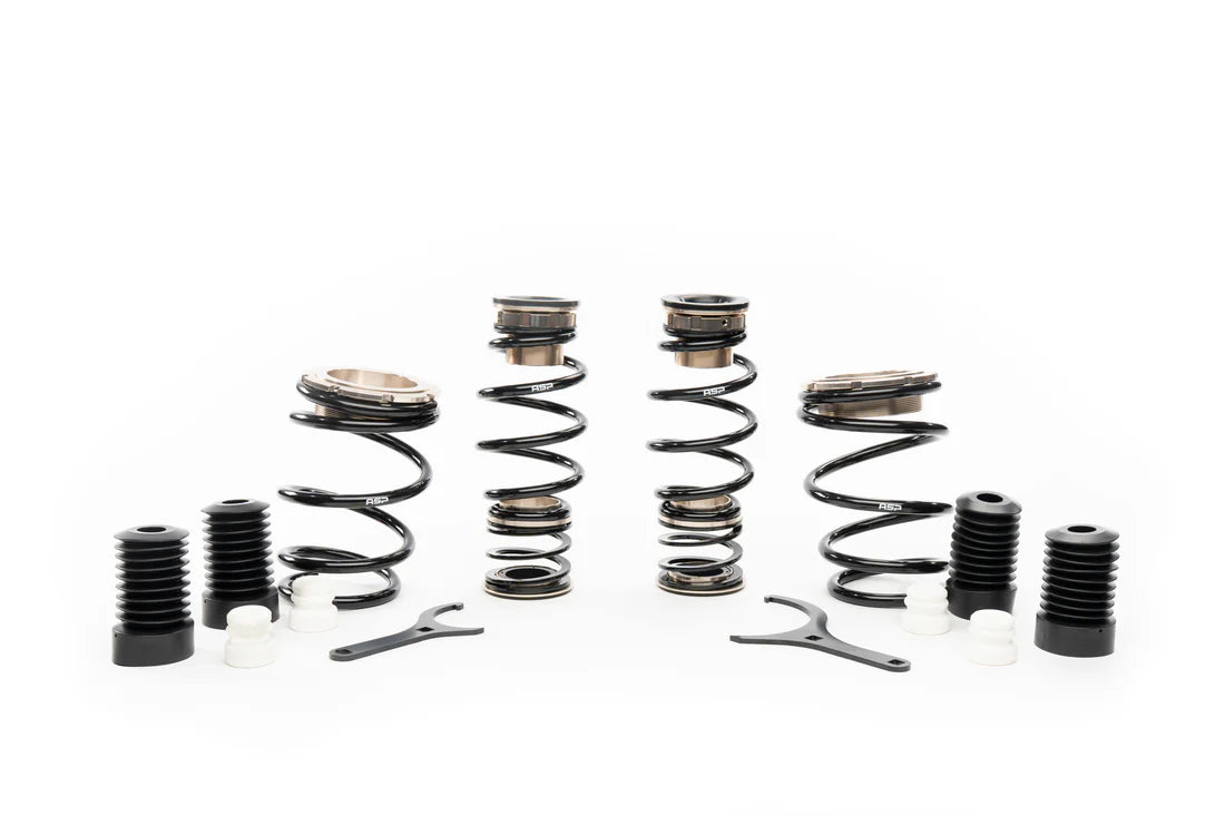 The vehicle specific custom springs used in the ASP kit are designed to work optimally with carefully calculated OEM damper travel lengths, specifically for lowered ride heights. This package allows you to enjoy OEM-like ride quality combined with height adjustability and increased chassis stability at higher speeds.